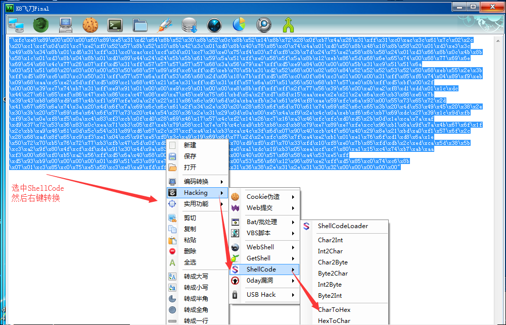 具体步骤:选中Char格式的Shellcode,右键-Hacking--ShellCode--Char2Hex