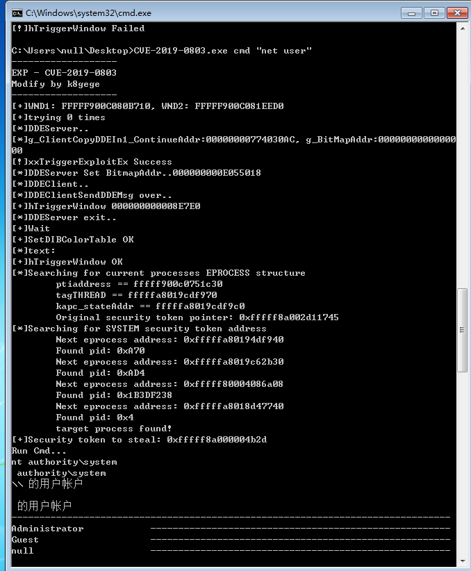 如图:可能需执行3-4次左右才能提权成功,测试系统为Win7 X64,其它未测。